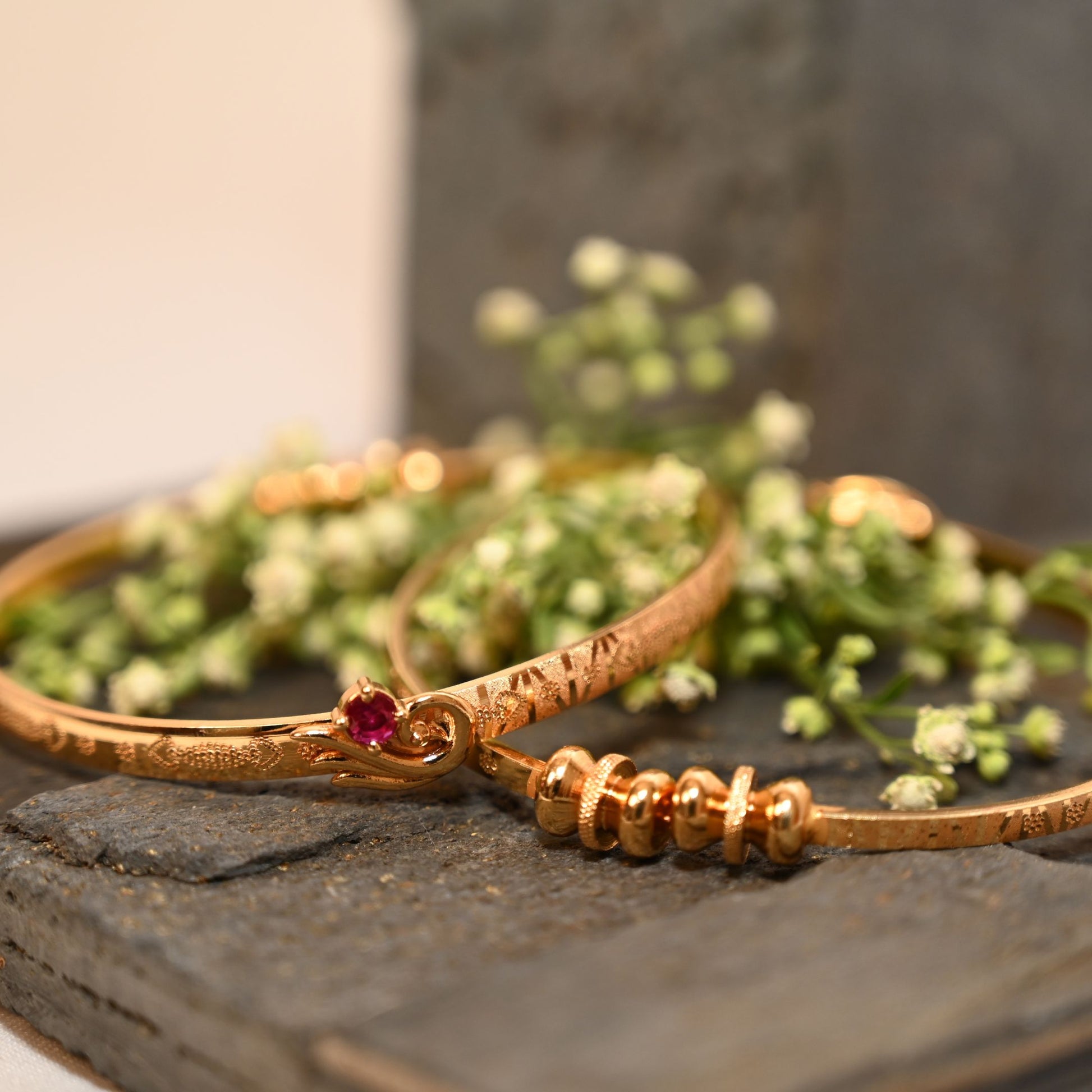Celebrate elegance in simplicity with this Gold-Plated Minimal Ruby Swirl Bangle Set. Perfect for women who love a balance of subtlety and charm, this set includes two beautifully crafted bangles – one featuring polished golden bead accents, and the other adorned with a graceful swirl design set with a ruby-red stone.