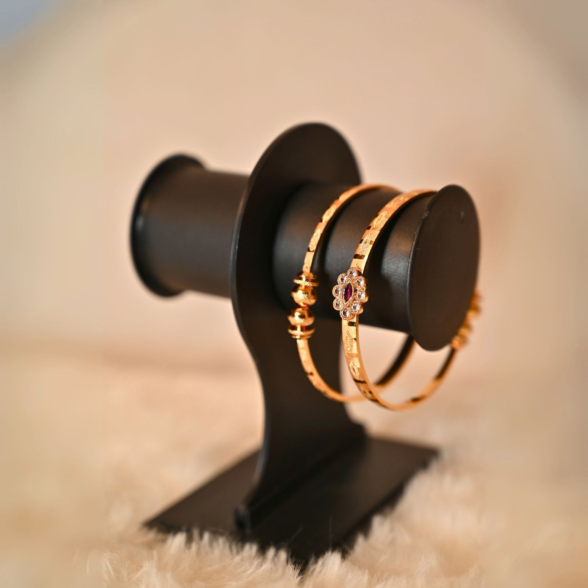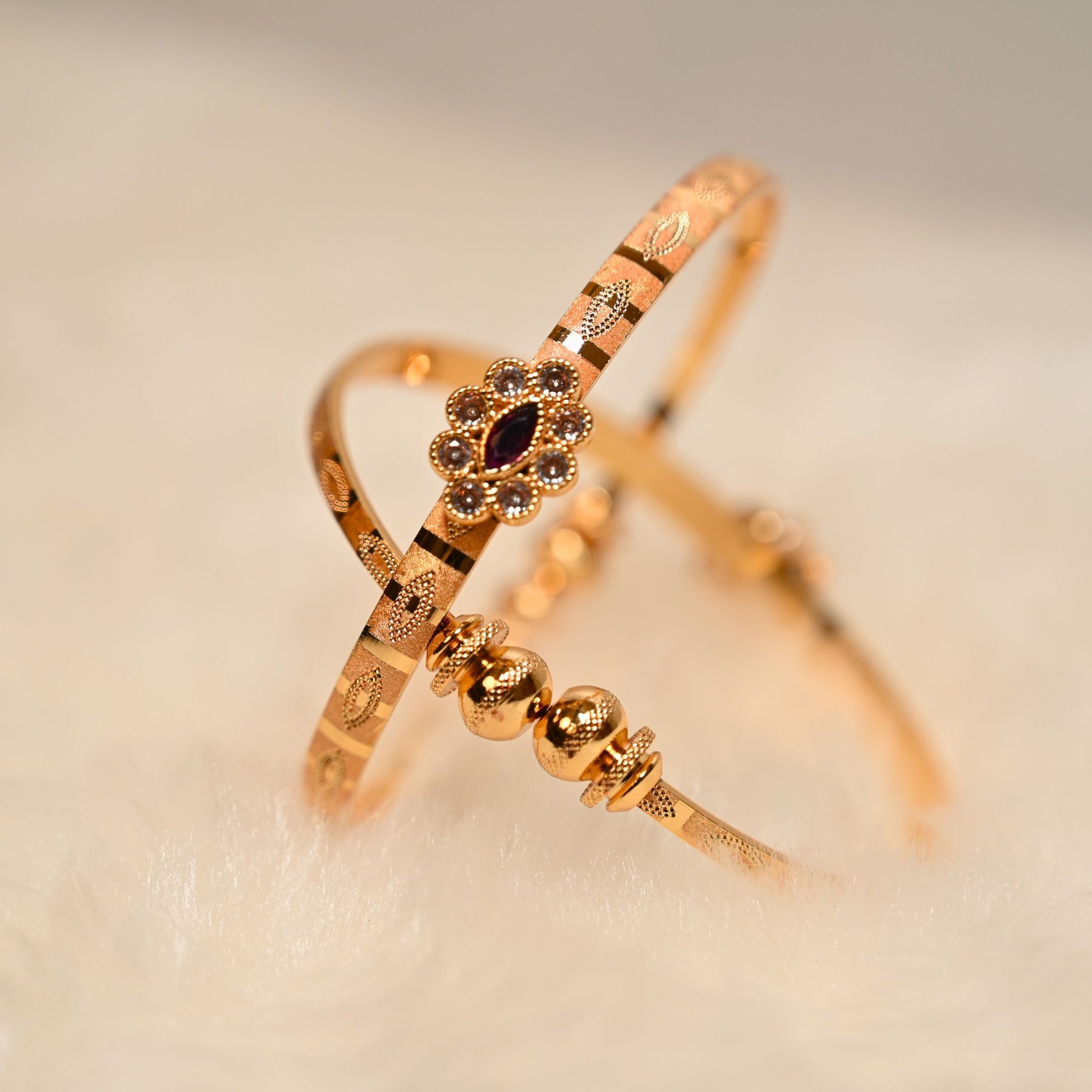 Embrace timeless beauty with this Gold-Plated Floral Etched Bangle Set, designed to add a graceful charm to your everyday and festive looks. Featuring intricate etching across the band, this bangle highlights a stunning floral centerpiece studded with a deep maroon stone, symbolizing elegance and tradition.