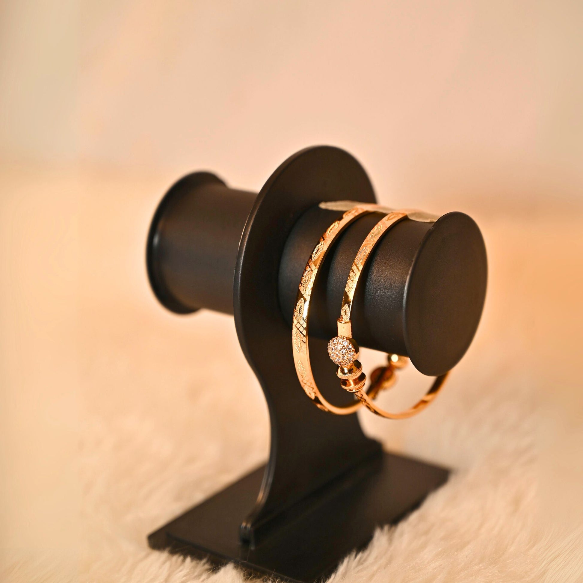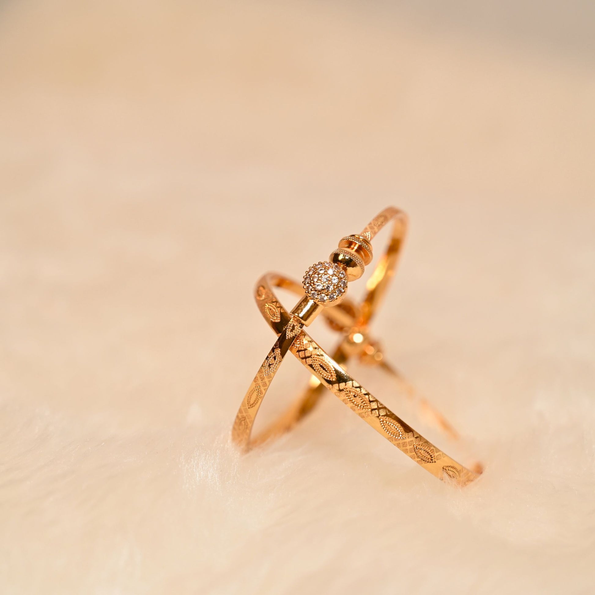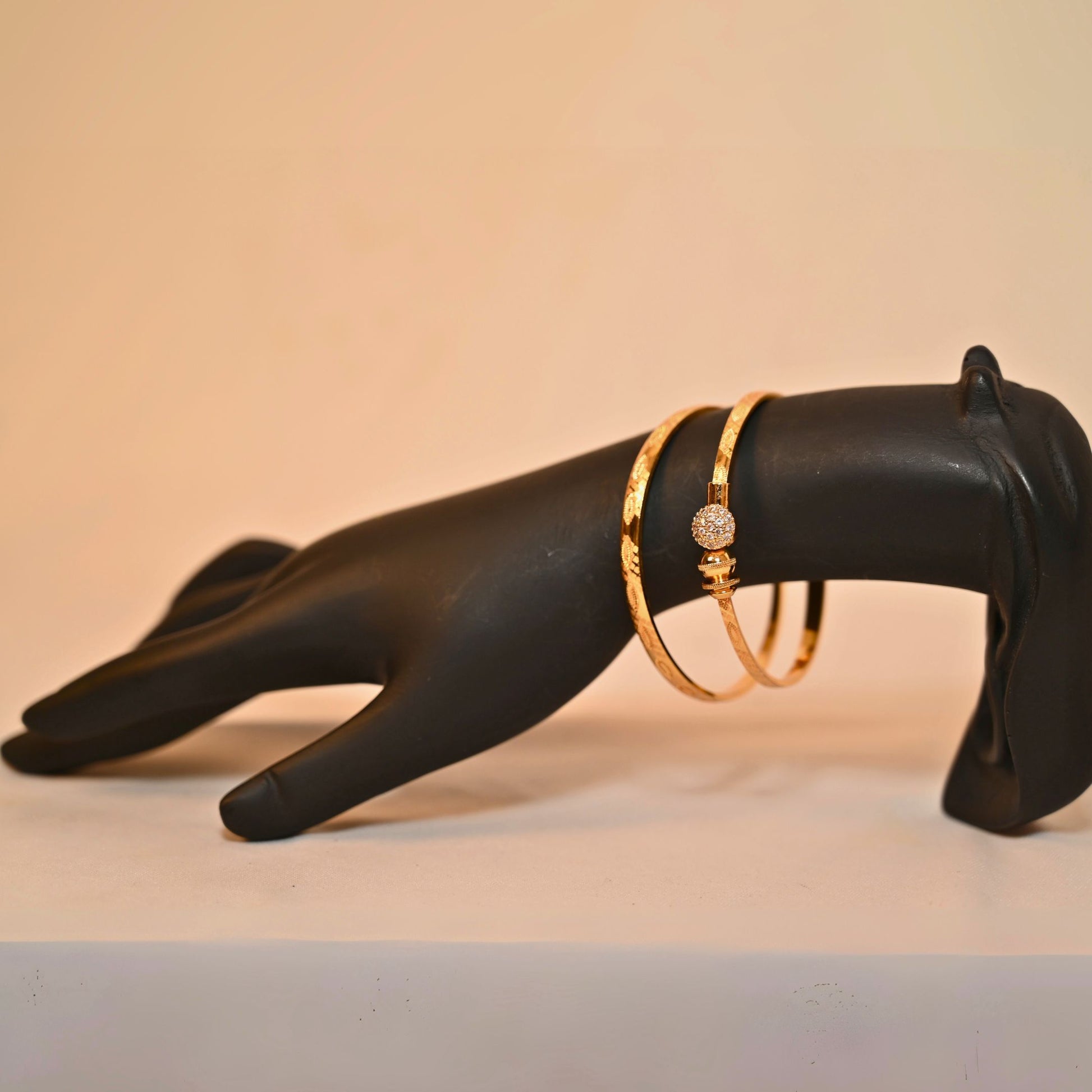Add a touch of royal charm to your collection with this Gold-Plated Designer Bangle. Crafted with detailed etching and fine patterns across the band, this bangle radiates elegance and tradition. At the center, a sparkling cluster of cubic zirconia stones set in a floral-inspired motif adds the perfect hint of glamour.