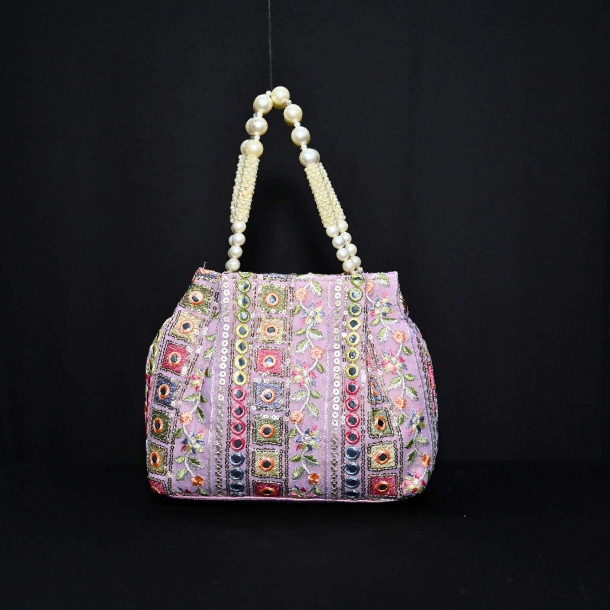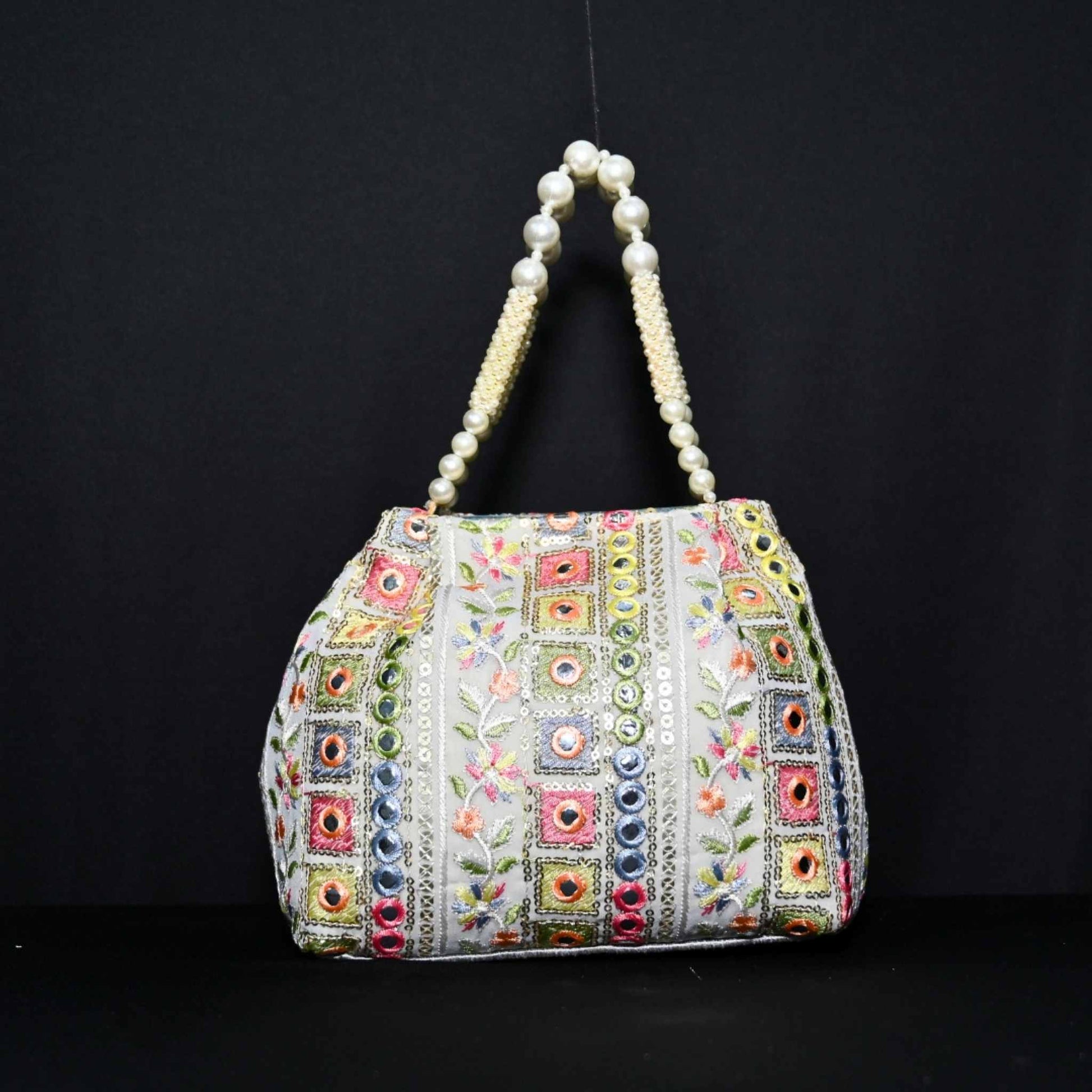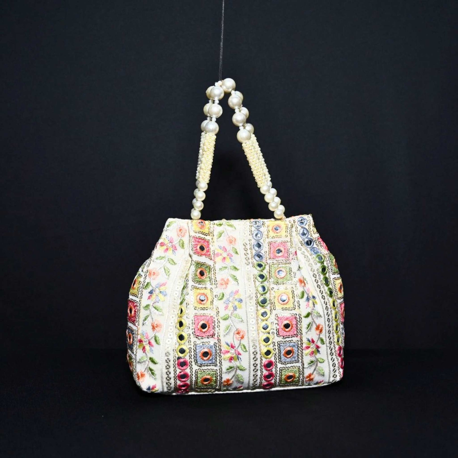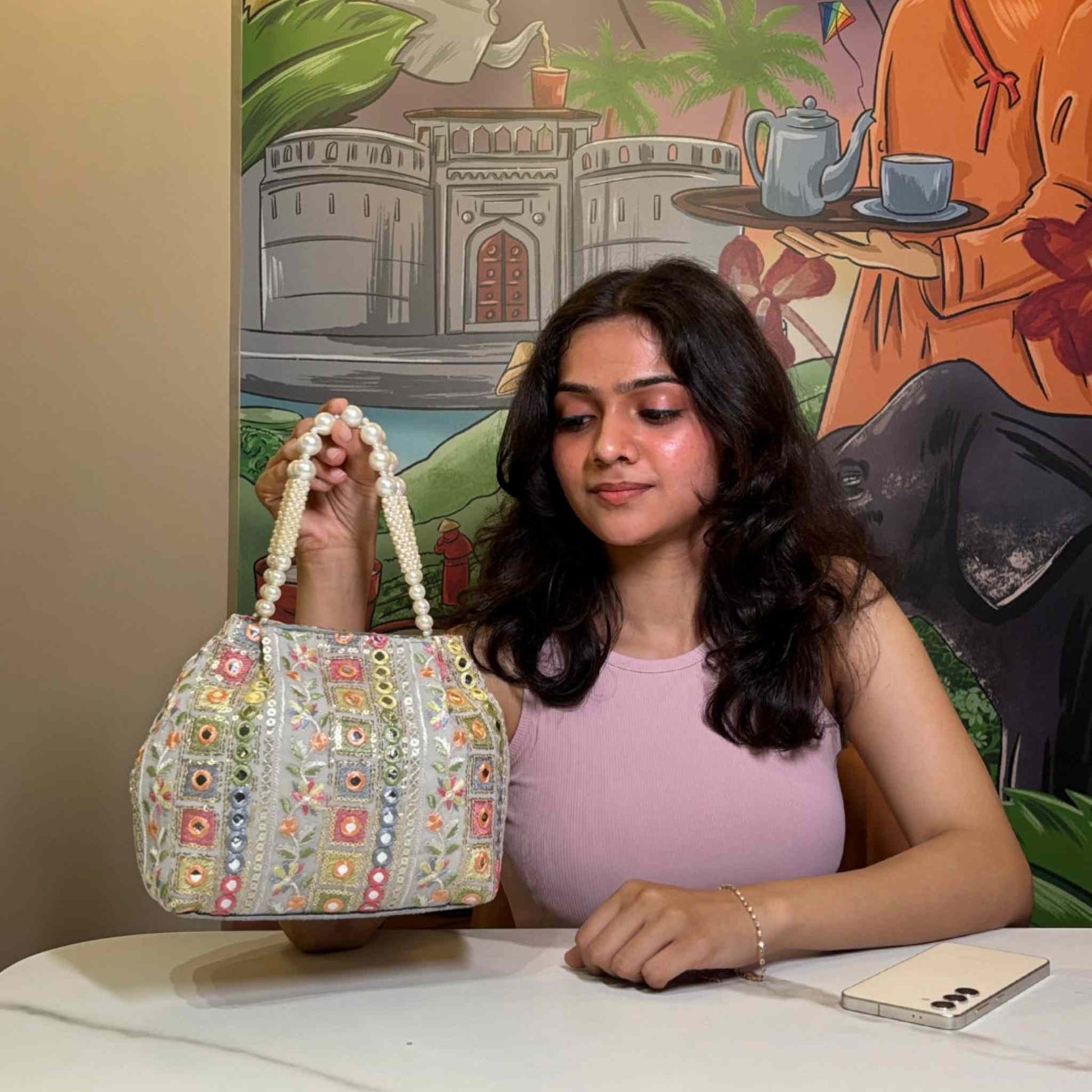 The Kashida Pauche is a beautifully crafted accessory that combines traditional craftsmanship with modern elegance. Made from premium-quality fabric, this pouch-style bag features intricate embroidery that showcases exceptional attention to detail. Its sturdy yet graceful handle is adorned with lustrous pearls, adding a luxurious and sophisticated touch.Lightweight yet spacious, the Kashida Pauche is perfect for carrying essentials during weddings, festive celebrations, and special occasions. Its versatile design complements both traditional outfits and contemporary Indo-Western attire, making it a timeless addition to any wardrobe.