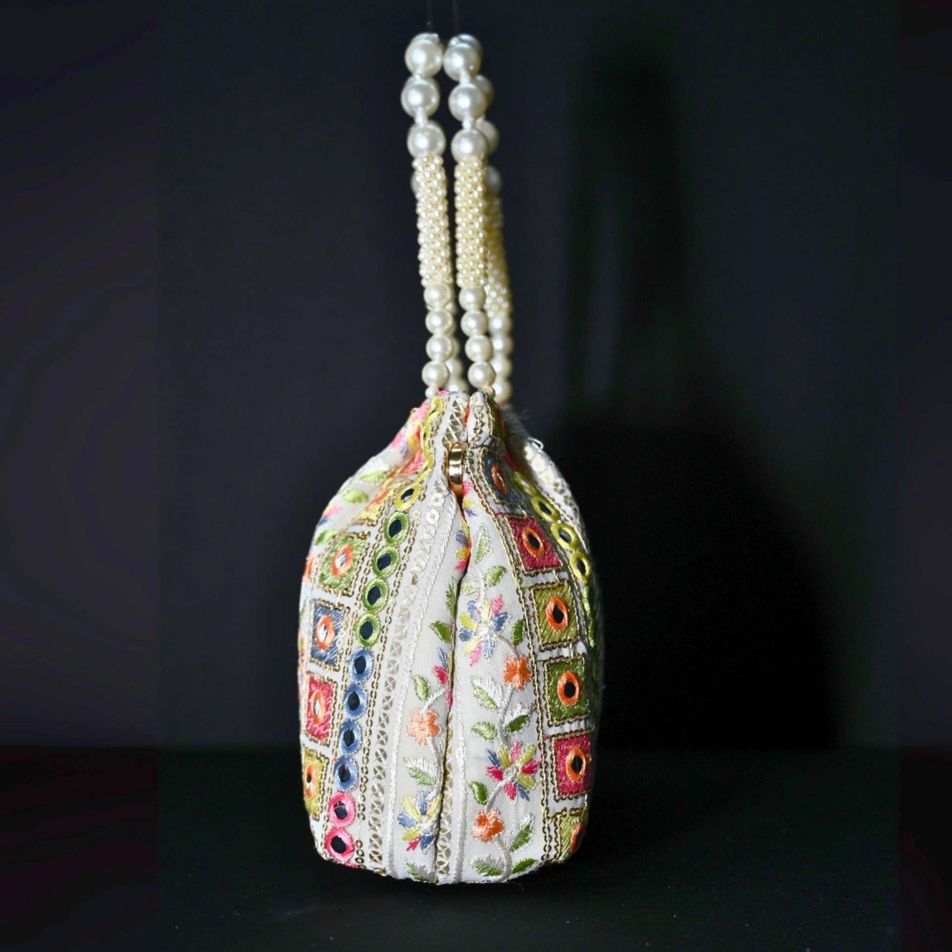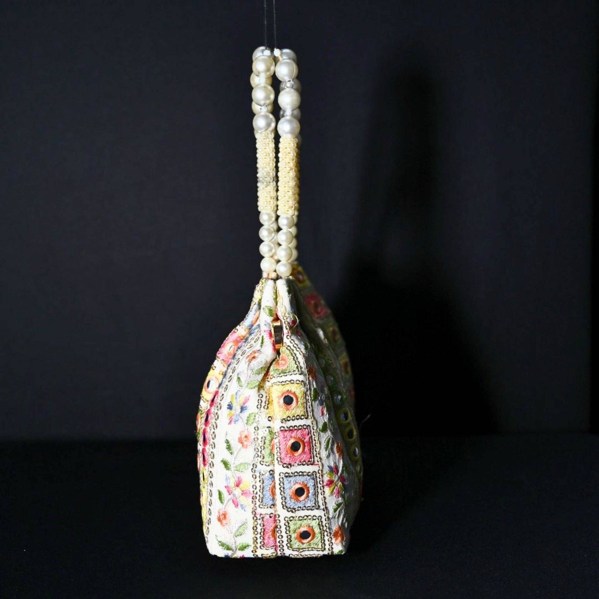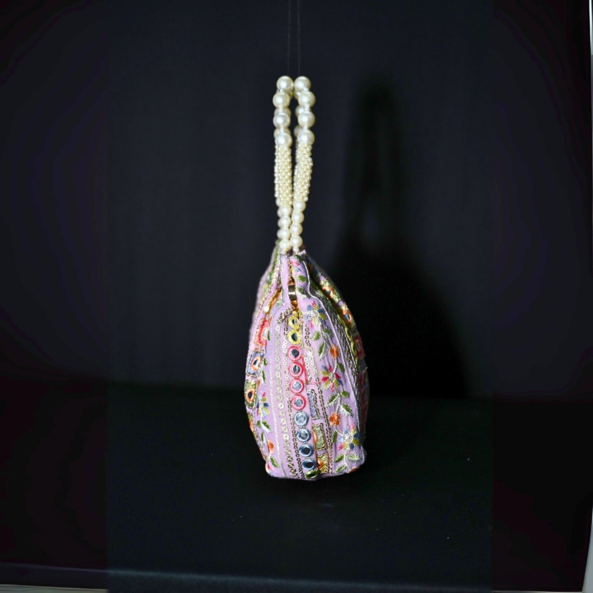 The Kashida Pauche is a beautifully crafted accessory that combines traditional craftsmanship with modern elegance. Made from premium-quality fabric, this pouch-style bag features intricate embroidery that showcases exceptional attention to detail. Its sturdy yet graceful handle is adorned with lustrous pearls, adding a luxurious and sophisticated touch.Lightweight yet spacious, the Kashida Pauche is perfect for carrying essentials during weddings, festive celebrations, and special occasions. Its versatile design complements both traditional outfits and contemporary Indo-Western attire, making it a timeless addition to any wardrobe.