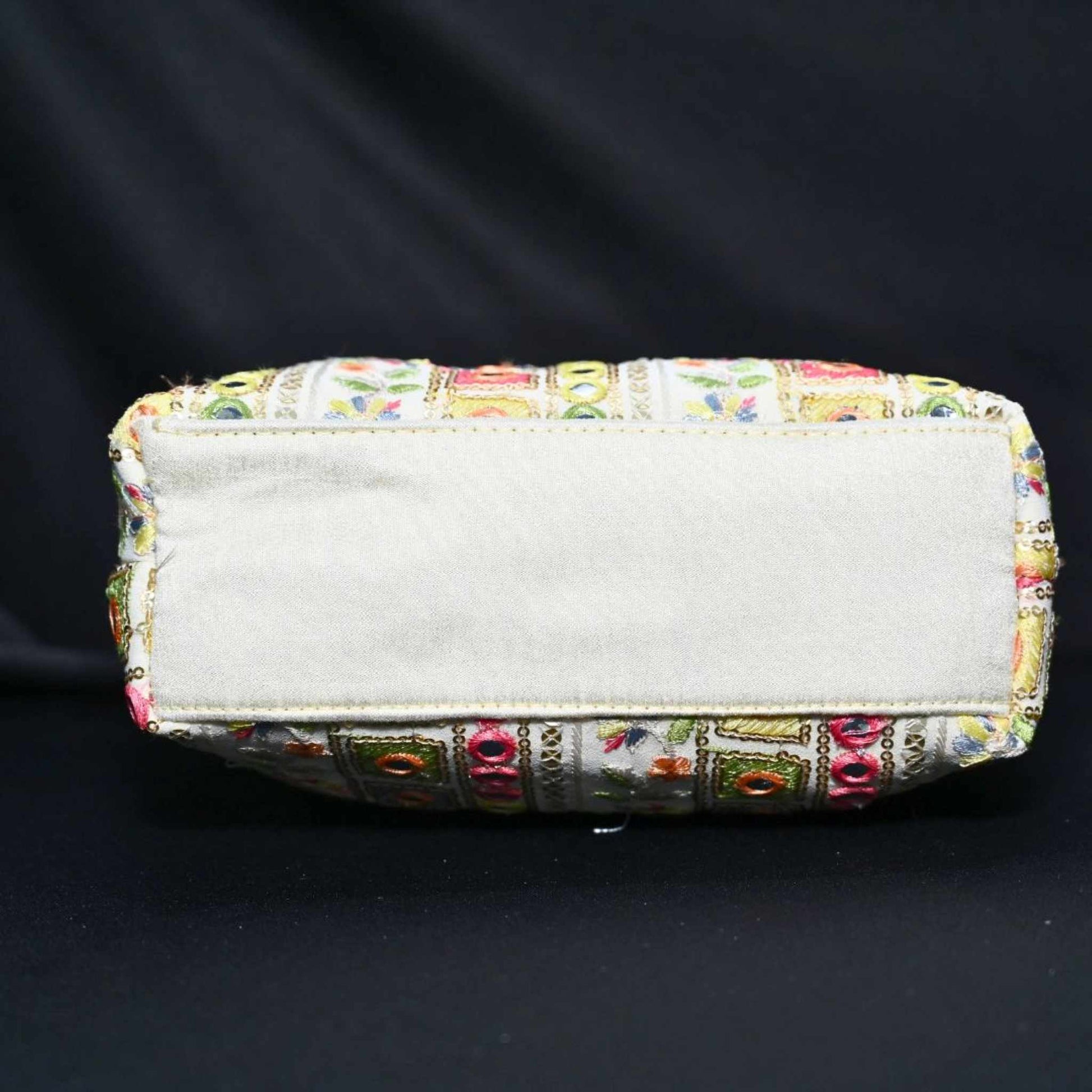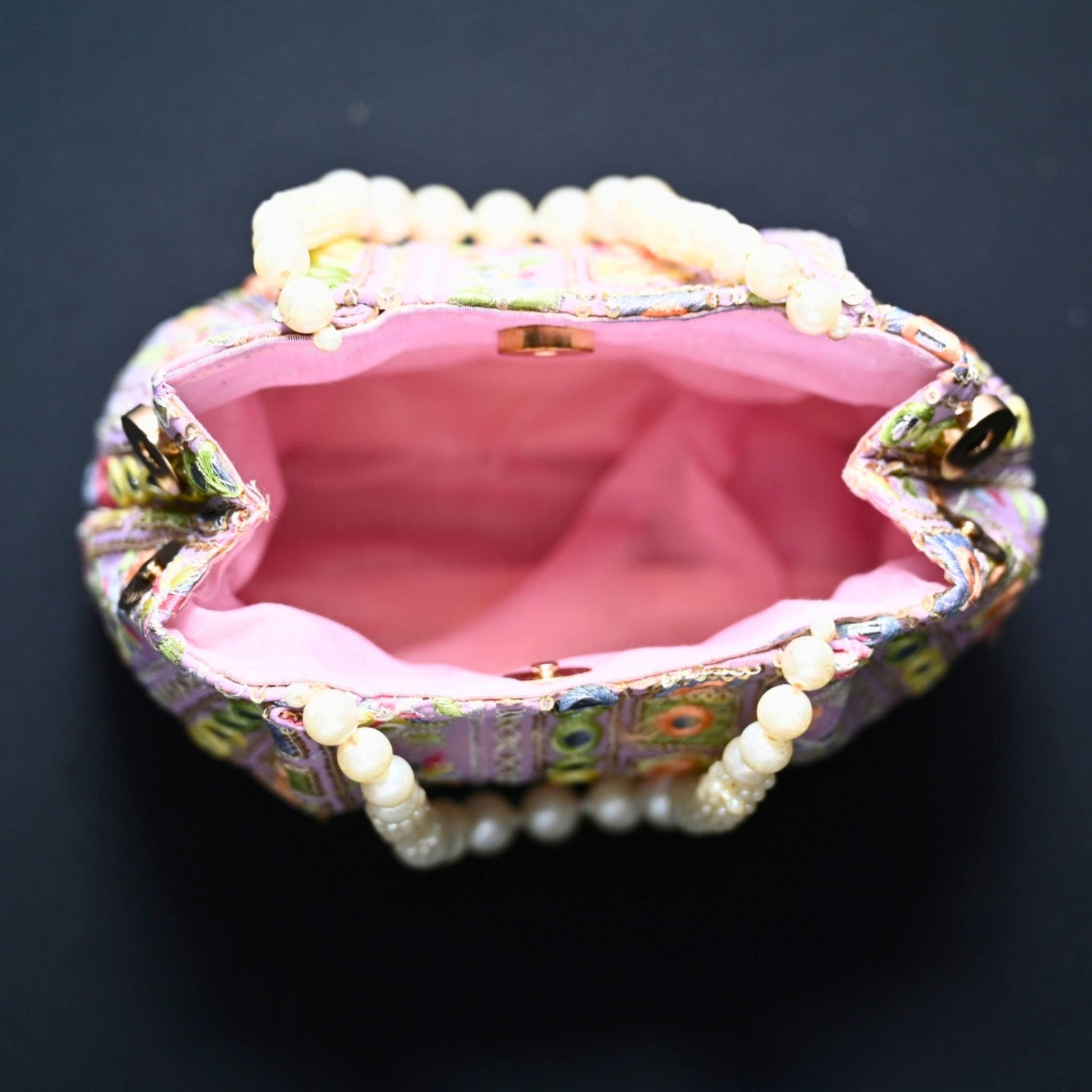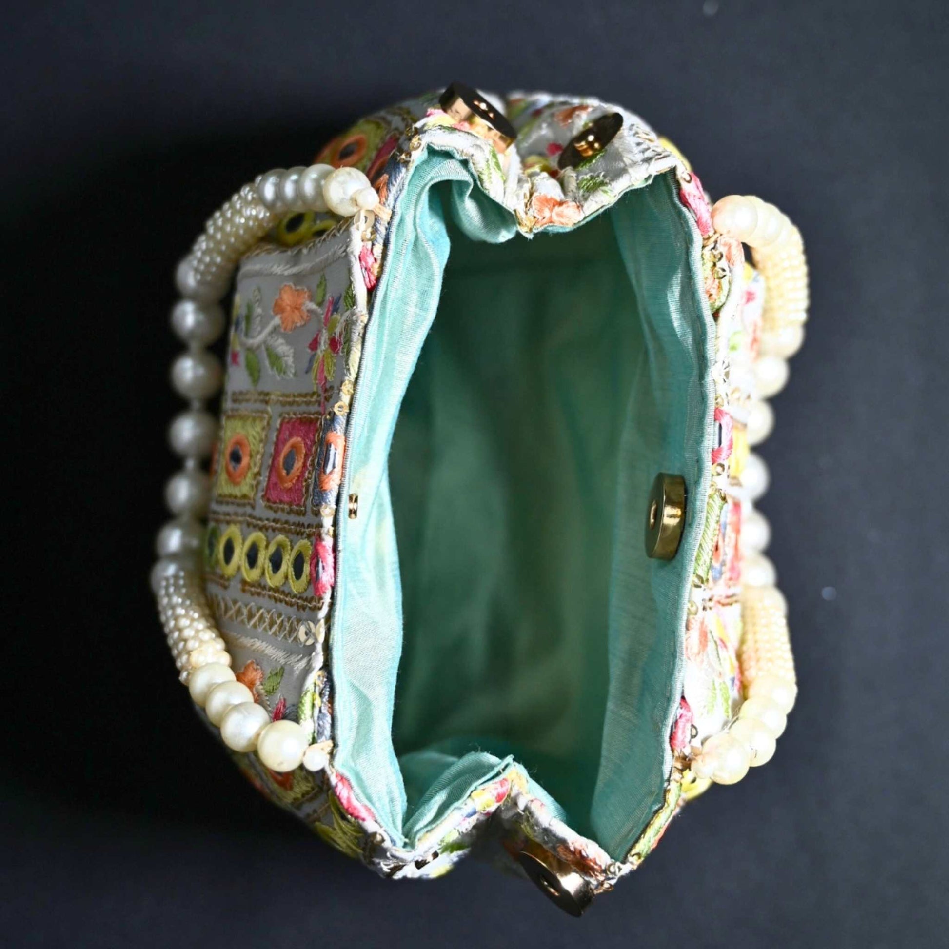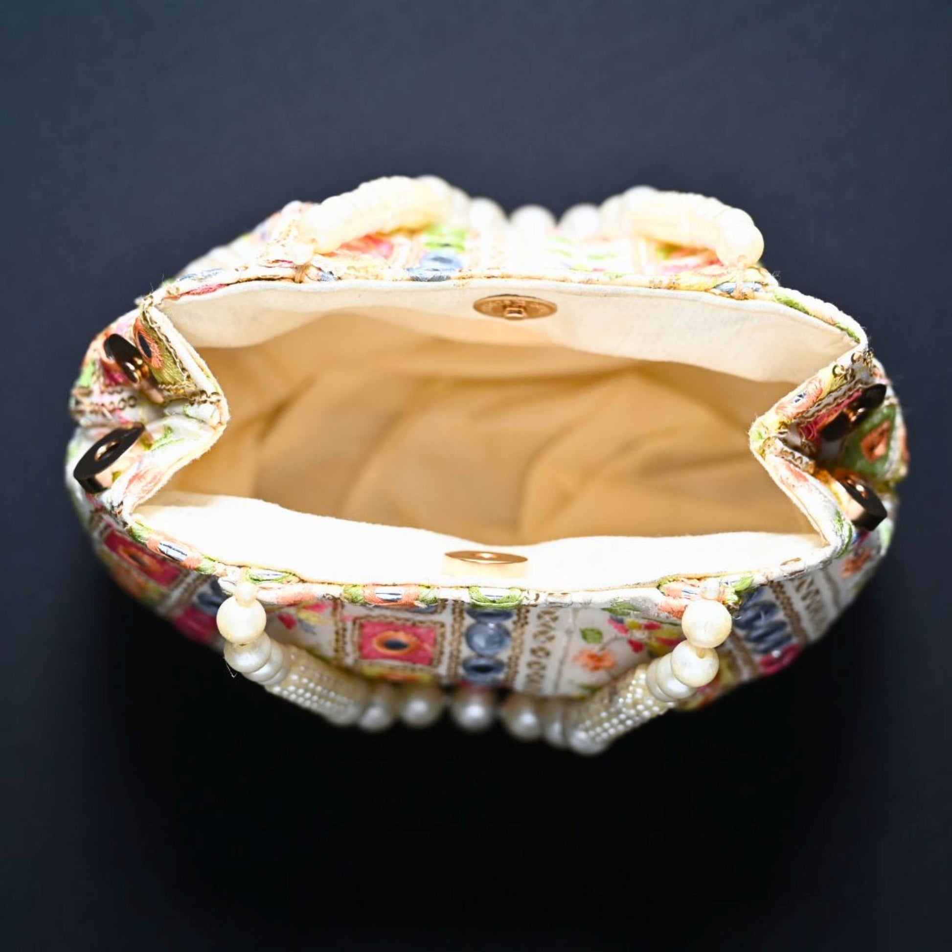 The Kashida Pauche is a beautifully crafted accessory that combines traditional craftsmanship with modern elegance. Made from premium-quality fabric, this pouch-style bag features intricate embroidery that showcases exceptional attention to detail. Its sturdy yet graceful handle is adorned with lustrous pearls, adding a luxurious and sophisticated touch.Lightweight yet spacious, the Kashida Pauche is perfect for carrying essentials during weddings, festive celebrations, and special occasions. Its versatile design complements both traditional outfits and contemporary Indo-Western attire, making it a timeless addition to any wardrobe.