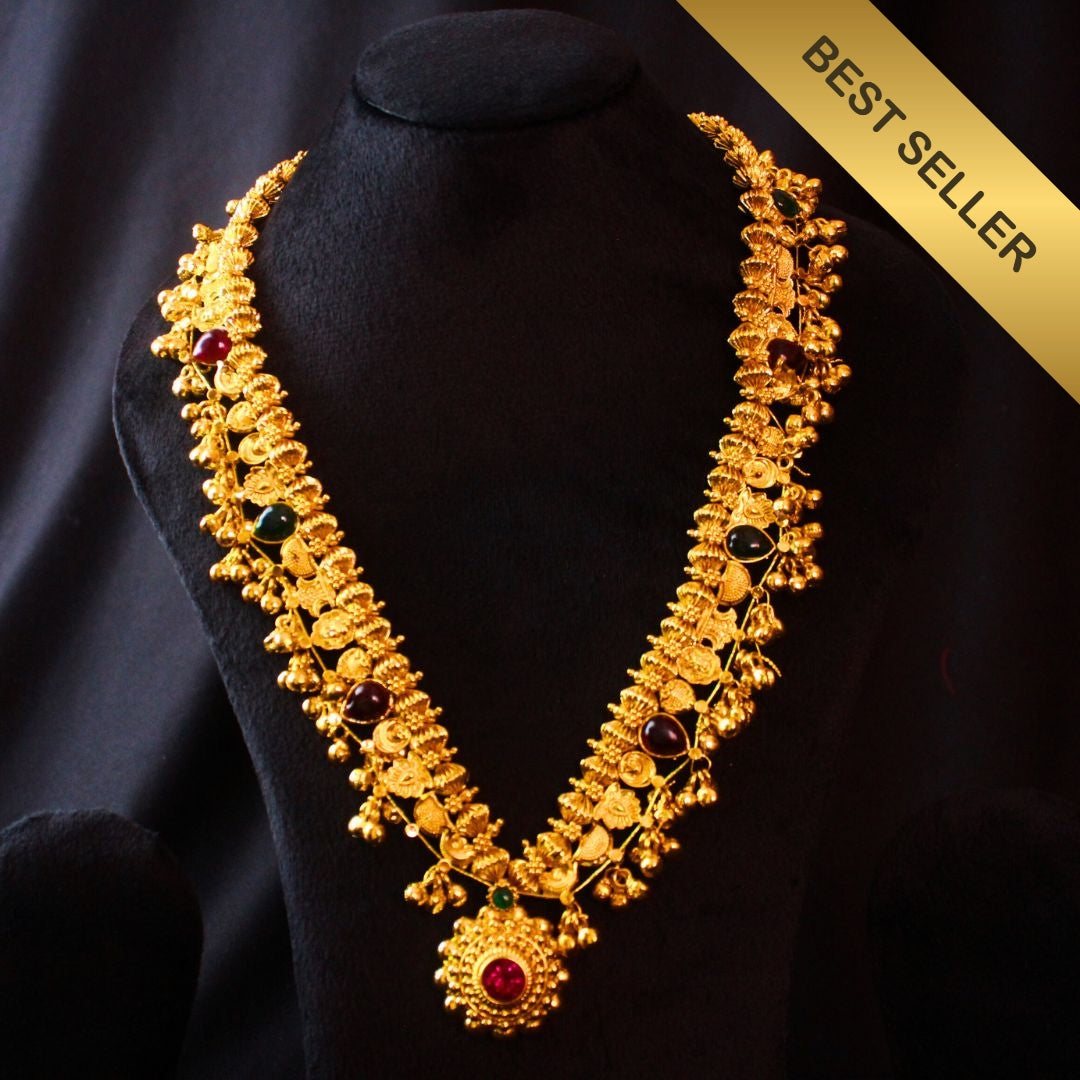 A traditional Kolhapuri Saaj made of golden finished metal and woven with a premium quality golden beads with maroon and green stones. The perfect choice for wedding and other traditional functions.