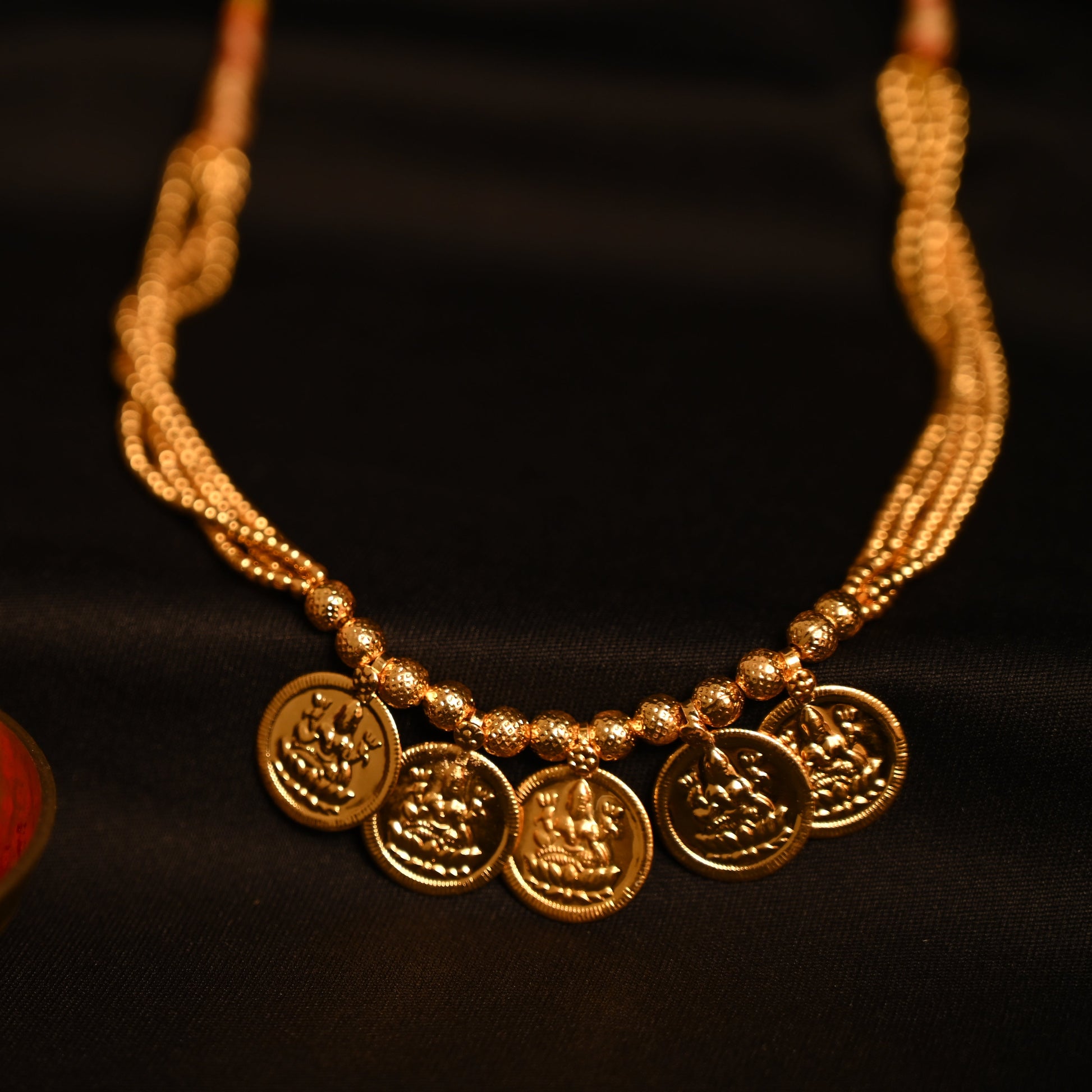 A Kolhapuri Putali Haar is a traditional Maharashtrian necklace featuring a strand of numerous flat, round, gold-plated coins (putalis) adorned with intricate Lakshmi carvings, symbolizing prosperity and wealth. This historically rich piece, dating back to the 17th century, is often strung with a red thread and is ideal for festive occasions, traditional events, and bridal wear, complementing Maharashtrian ensembles like sarees and lehengas