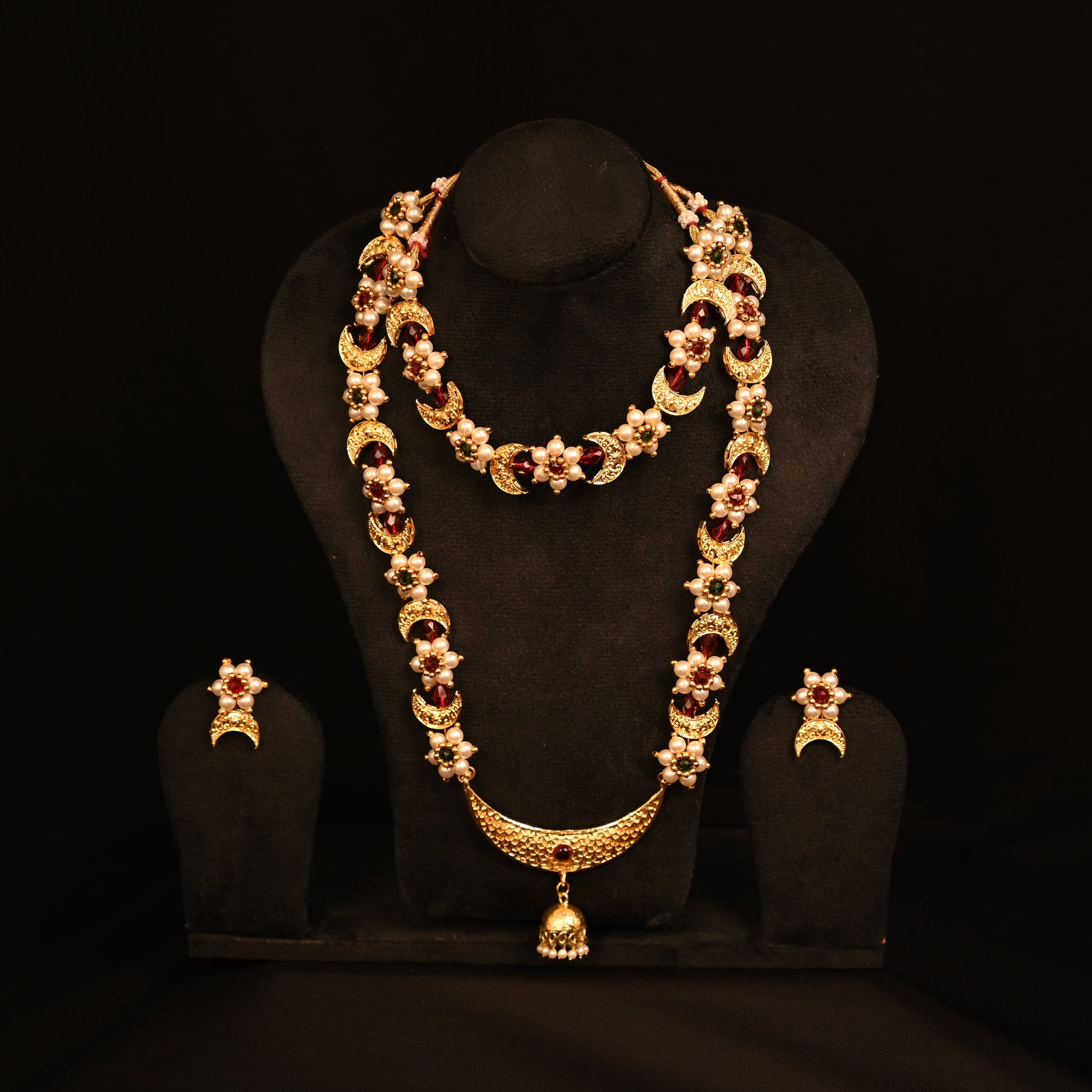 Elevate your traditional look with this stunning Royal Crescent Floral chandrahar , designed to bring timeless elegance to every occasion. The set features a beautifully crafted long necklace with intricate crescent motifs, embellished with ruby-red stones, pearls, and delicate floral accents. A shorter necklace and matching earrings complete the regal ensemble, making it perfect for weddings, festive celebrations, and special events.