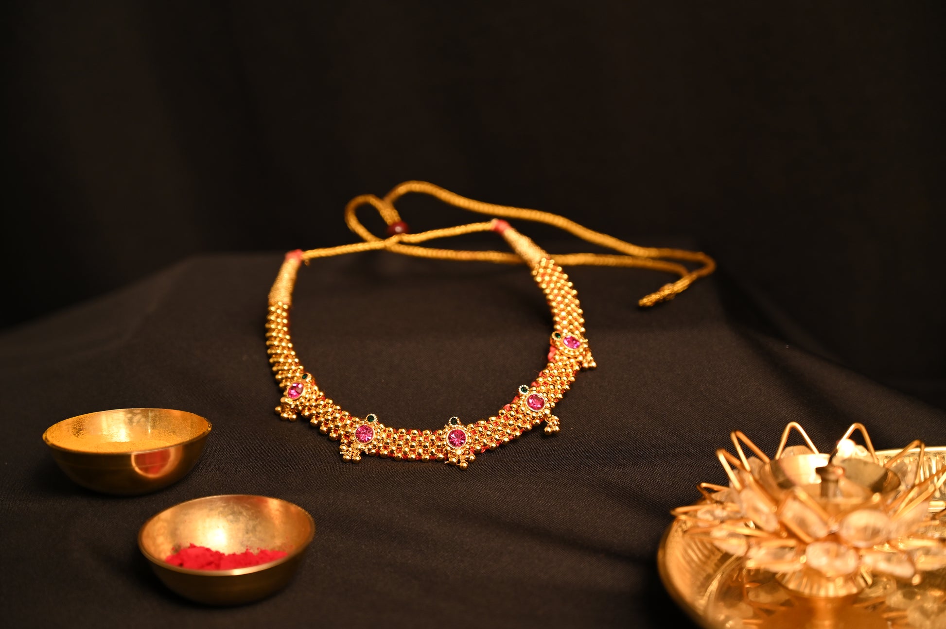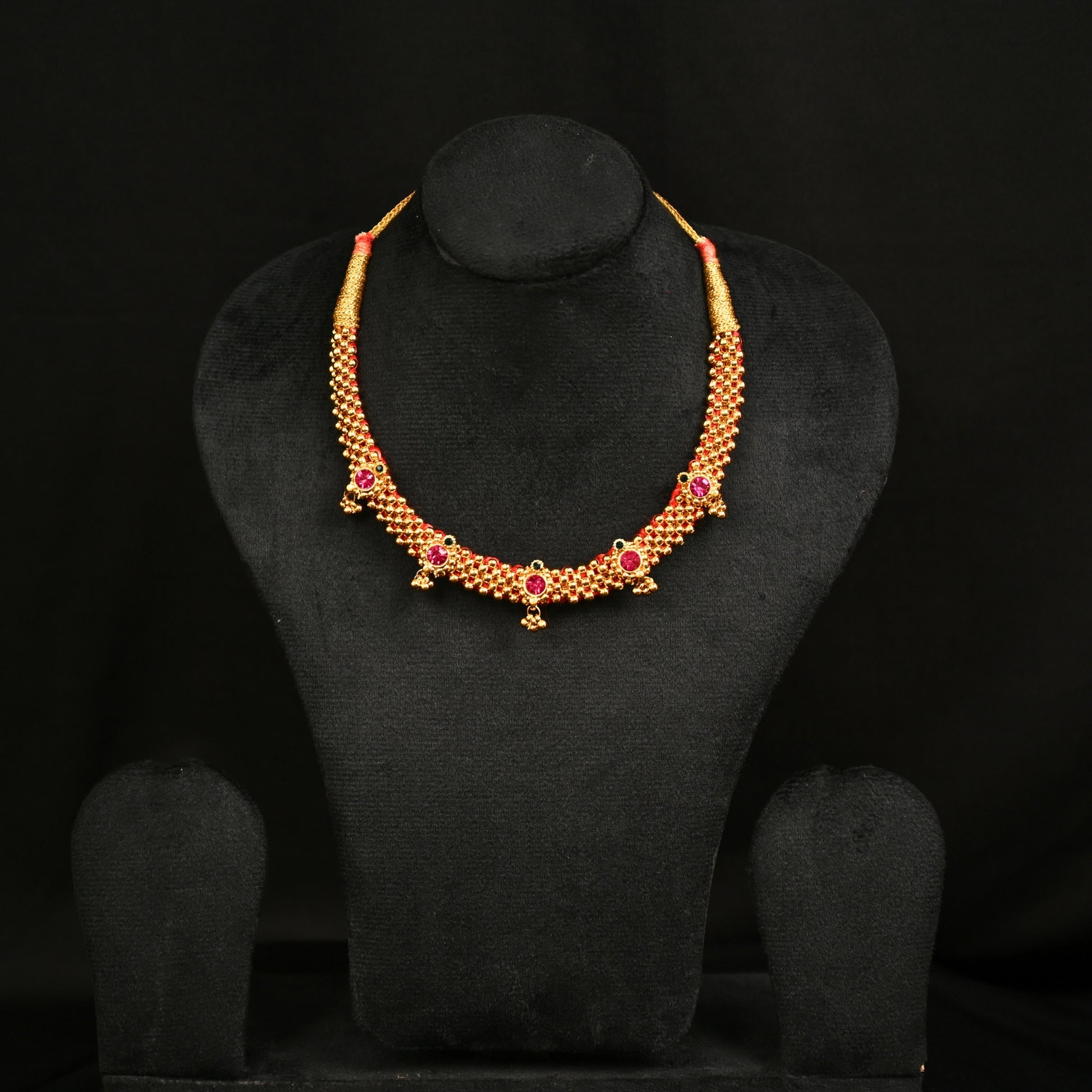 Add a touch of sophistication to your ethnic look with this Ruby Beaded Gold-Plated Thushi. Designed with rows of intricately arranged golden beads, the necklace is highlighted with striking ruby-red stones at the center, accented by tiny hanging droplets for a graceful finish. Perfect for weddings, festive occasions, and traditional celebrations, this piece blends elegance with timeless charm.