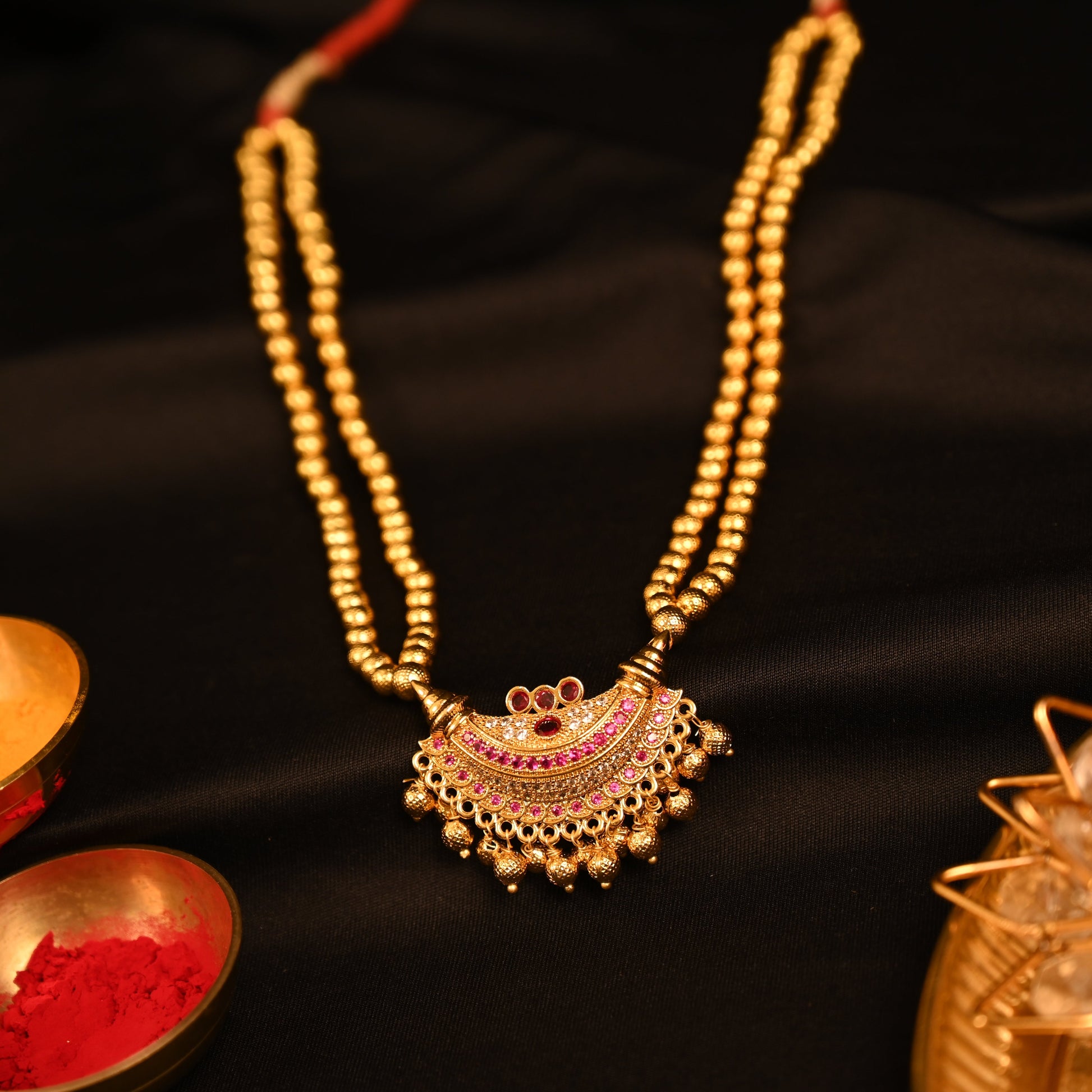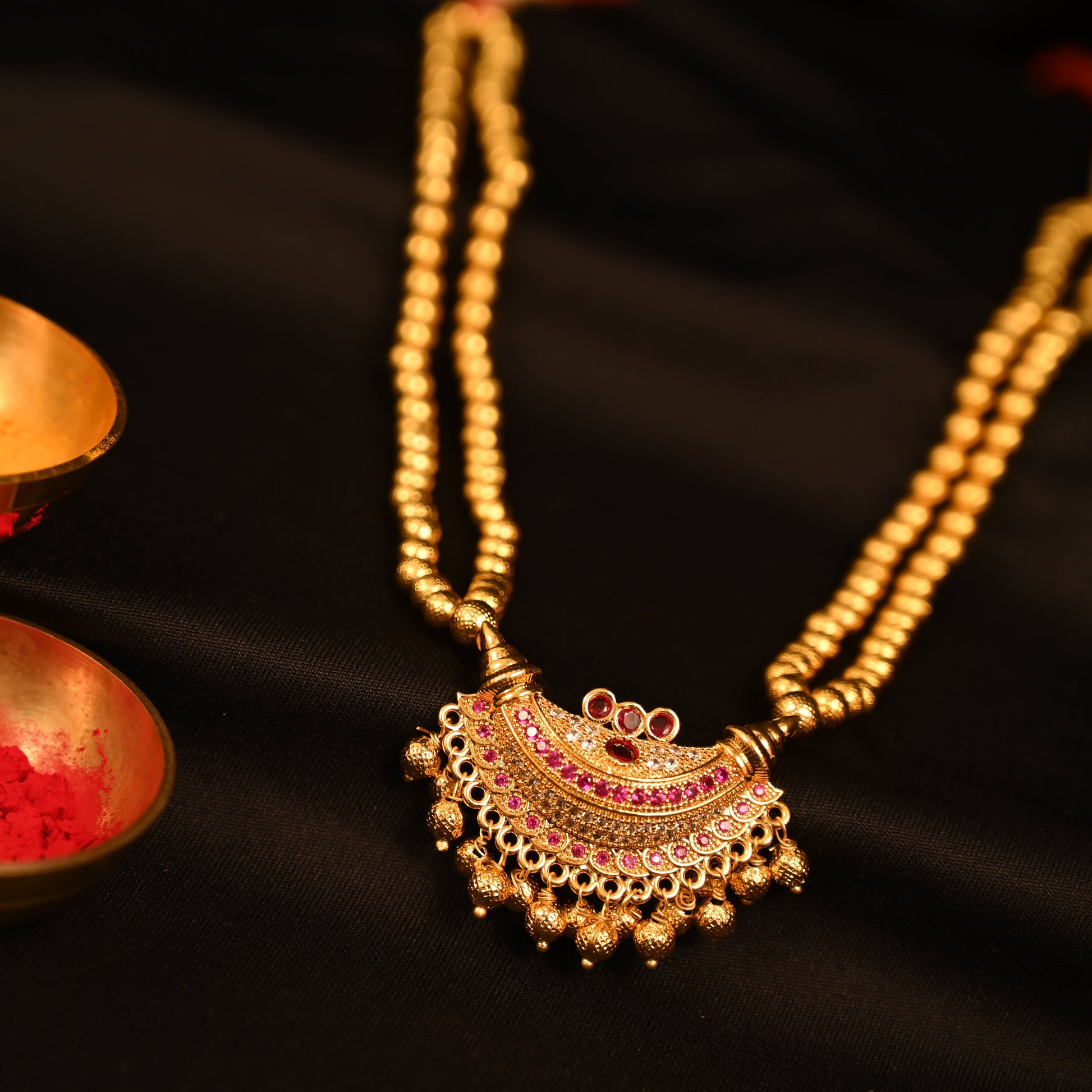 This versatile necklace offers a perfect blend of simplicity and grandeur. It's an ideal choice for complementing traditional Indian attire for occasions ranging from daily elegance to smaller festive gatherings.