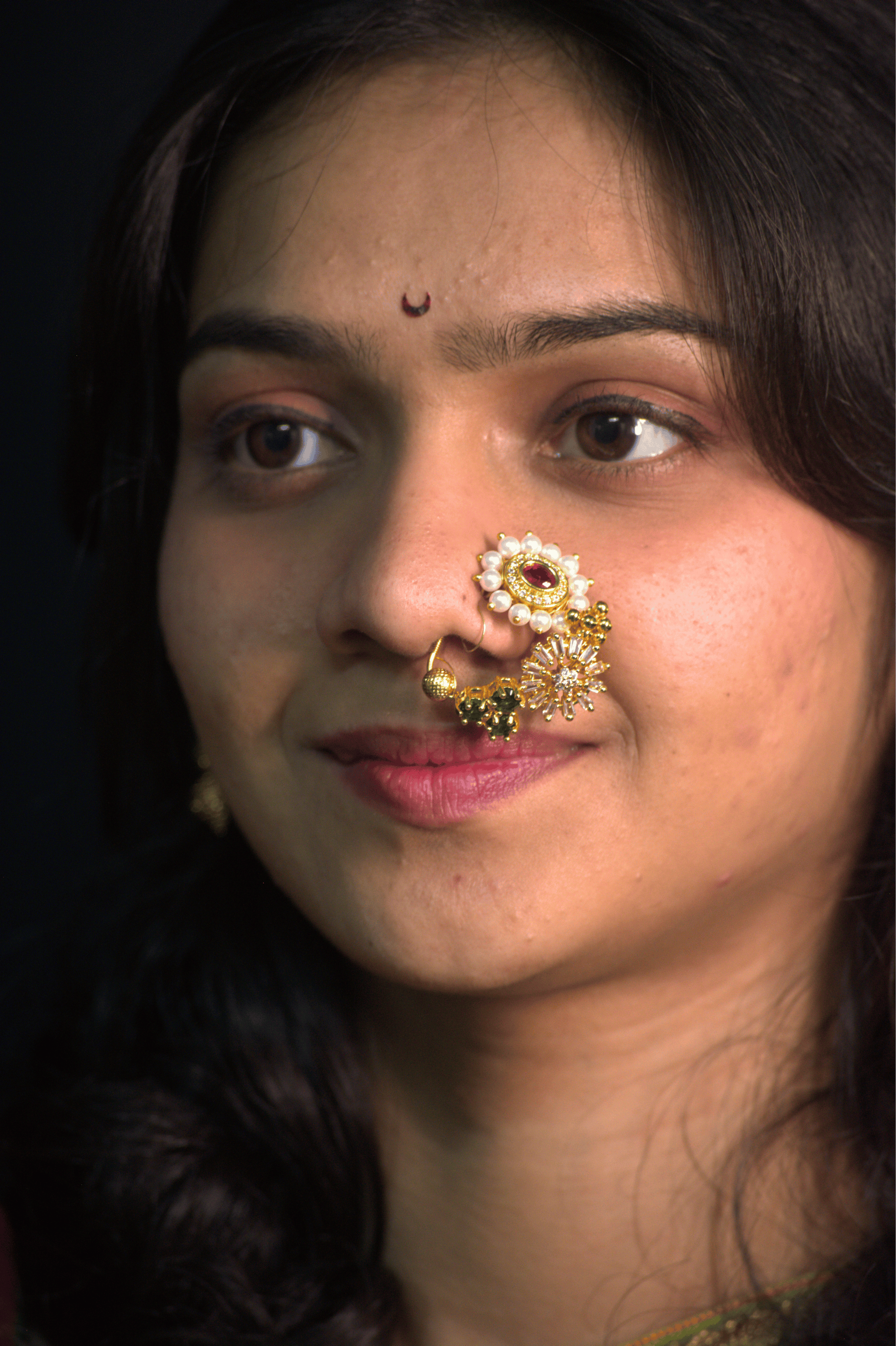 This elaborate nath is a true statement accessory, blending traditional Maharashtrian elements with contemporary crystal design, ideal for festive and wedding celebrations.