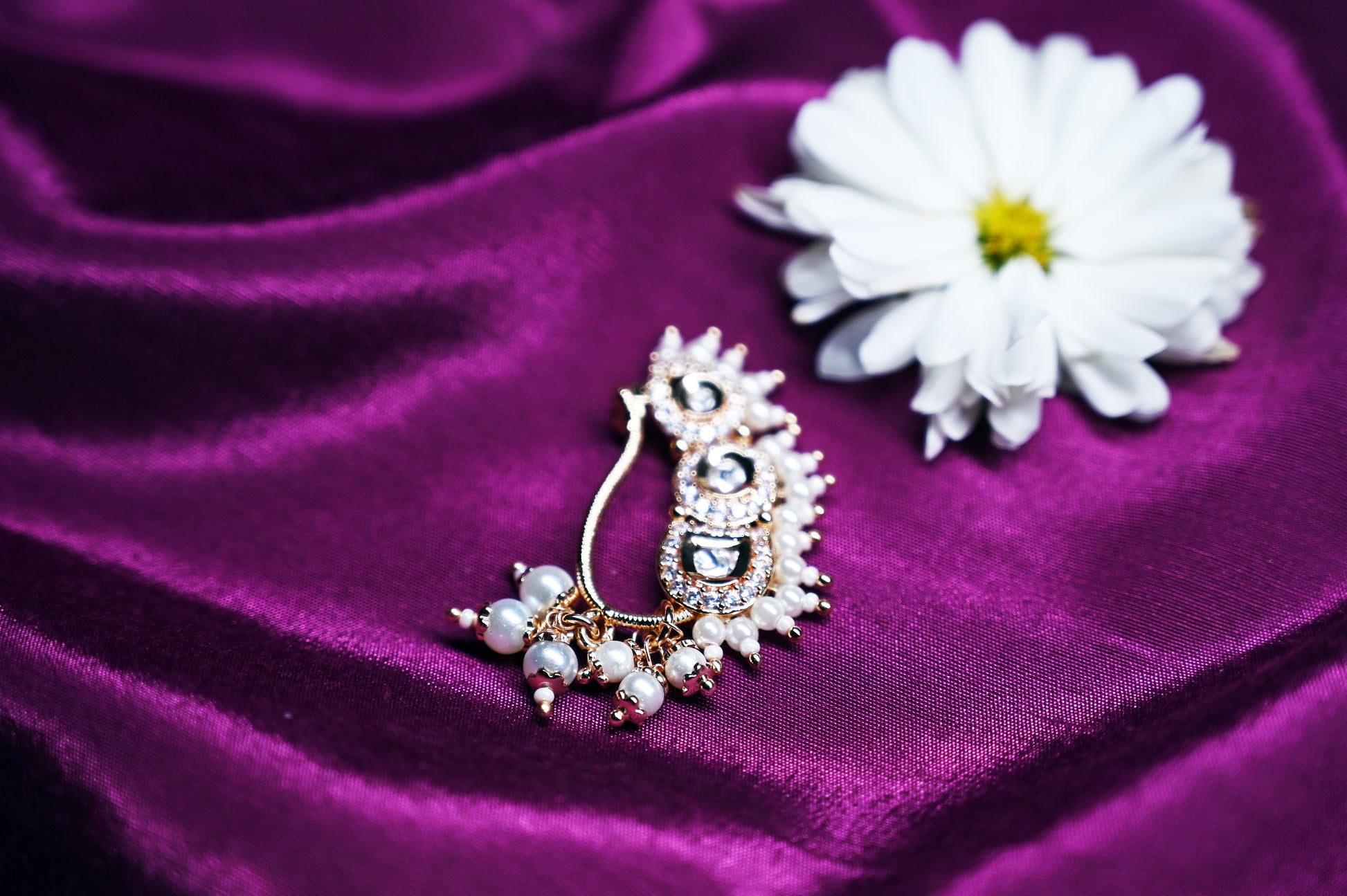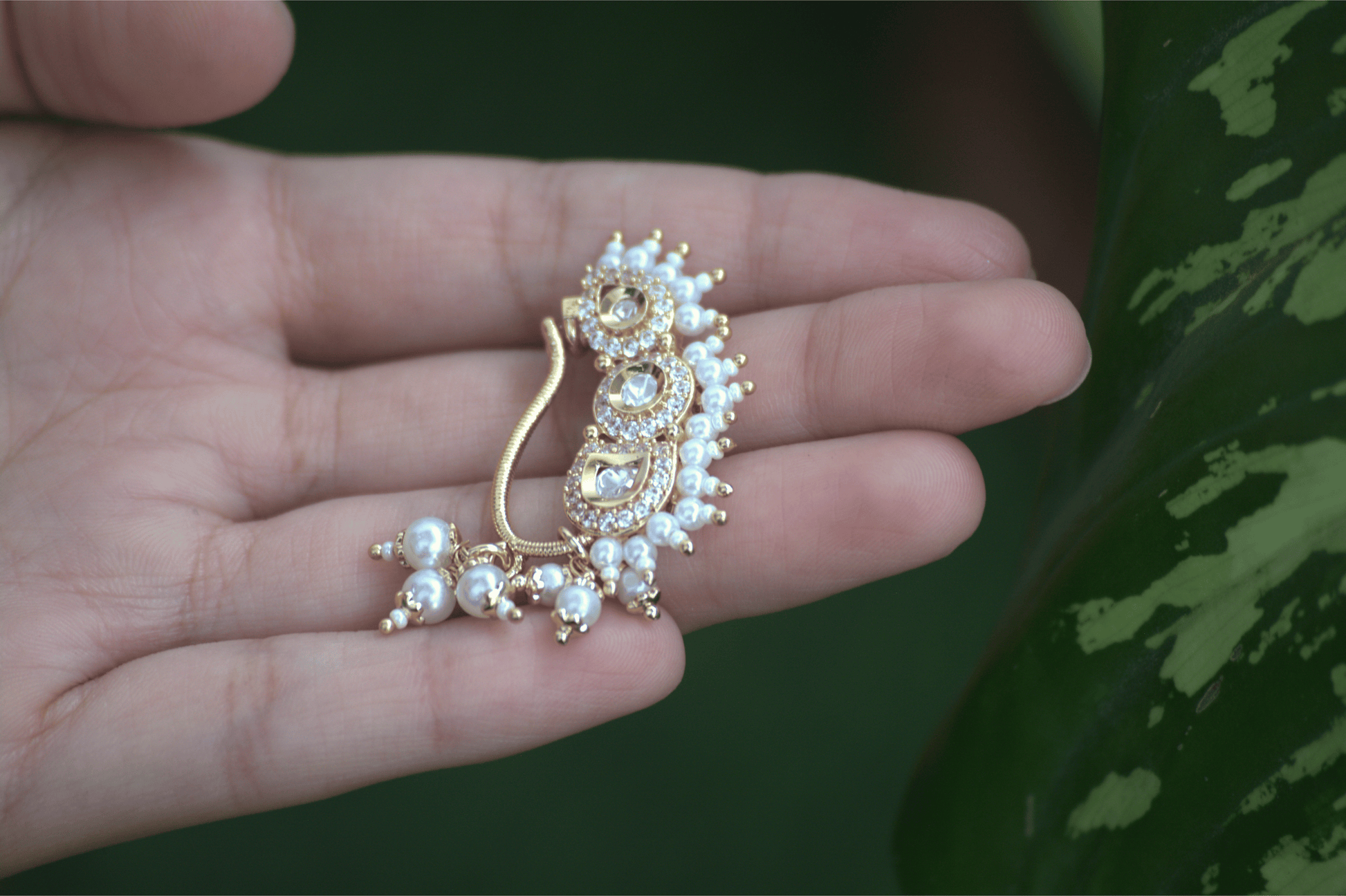 From the top and outer edge of the design, a lavish cluster of hand-set white pearls radiates outwards, creating a textured and rich border. More pearls, interspersed with small gold beads, form a beautiful, dangling cluster at the bottom of the nath. The piece is secured by a classic curved gold-toned press-fit wire on the left side.