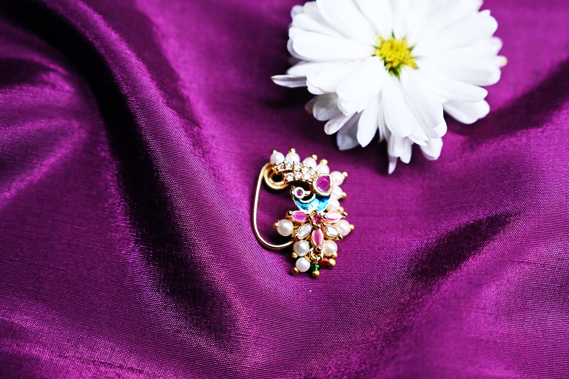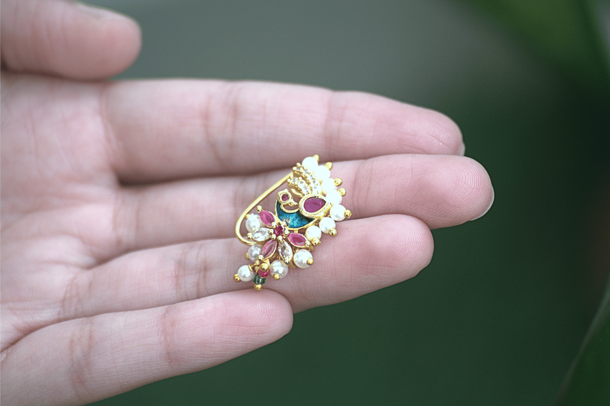 The Nath is an enchanting and detailed piece featuring a central peacock motif, symbolizing grace and beauty. The peacock's body is crafted with vibrant blue enamel, and its head is adorned with a tiny pink stone.