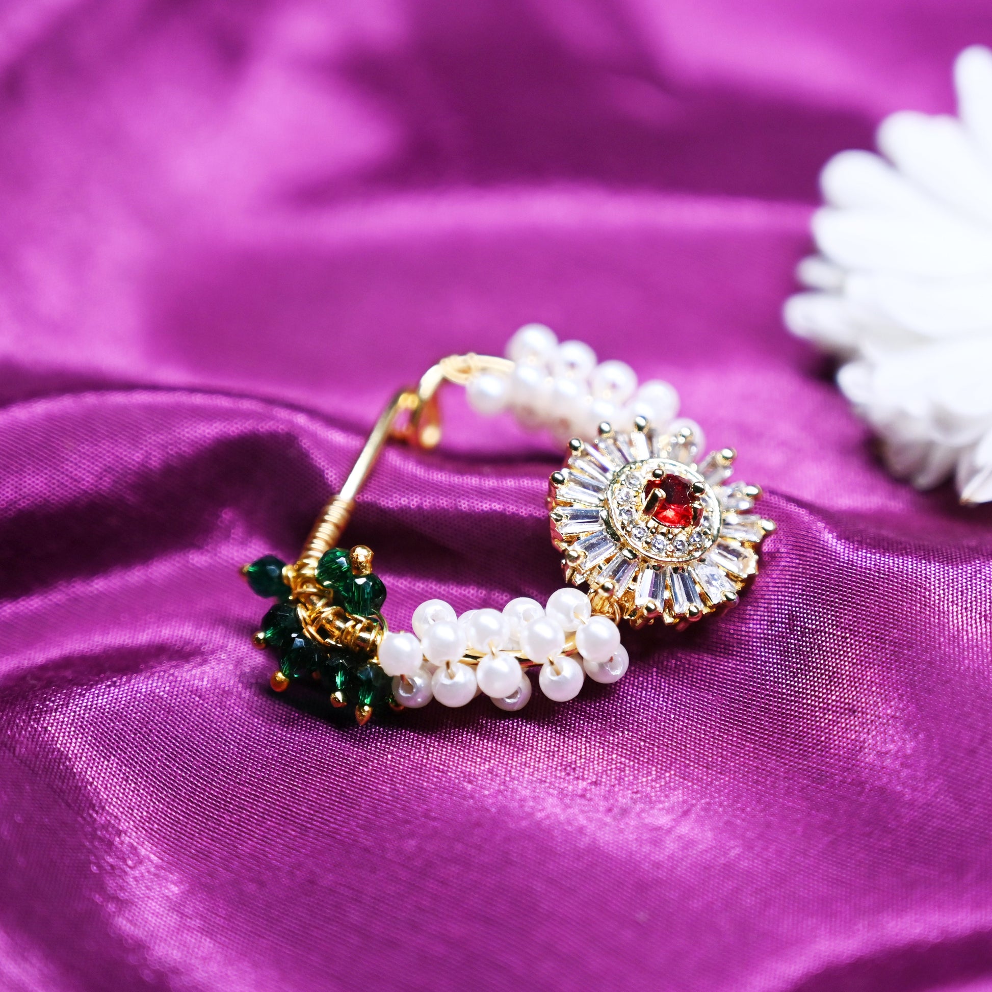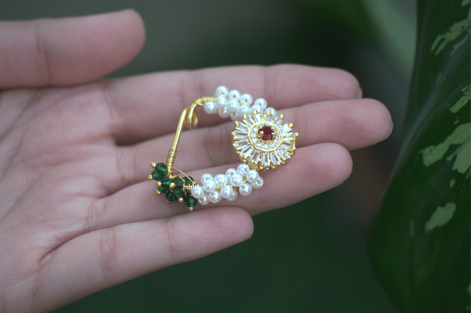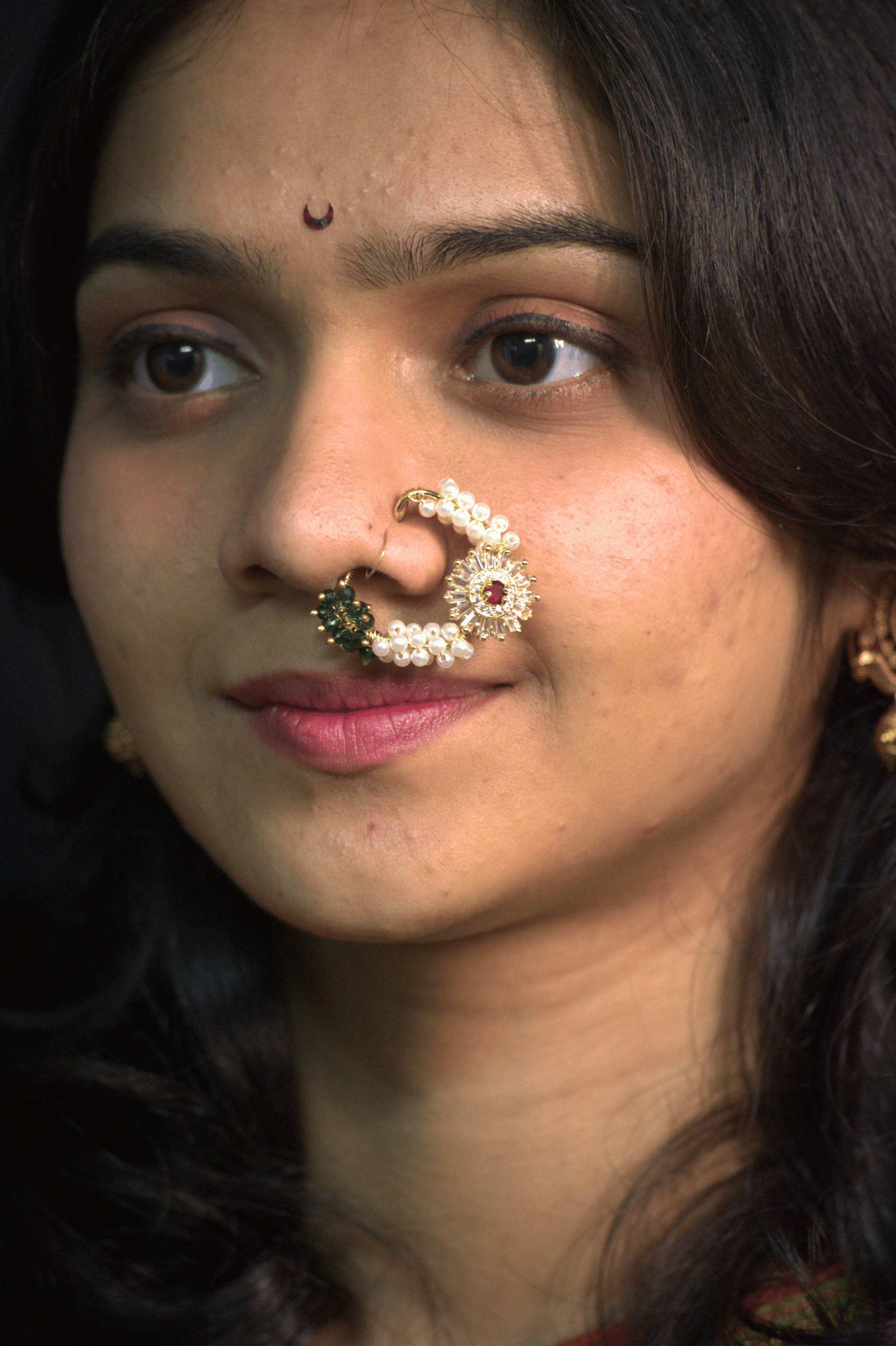 This exquisite nath is a modern take on a traditional accessory, perfect for adding a concise pop of color and brilliant shine to any festive ensemble.