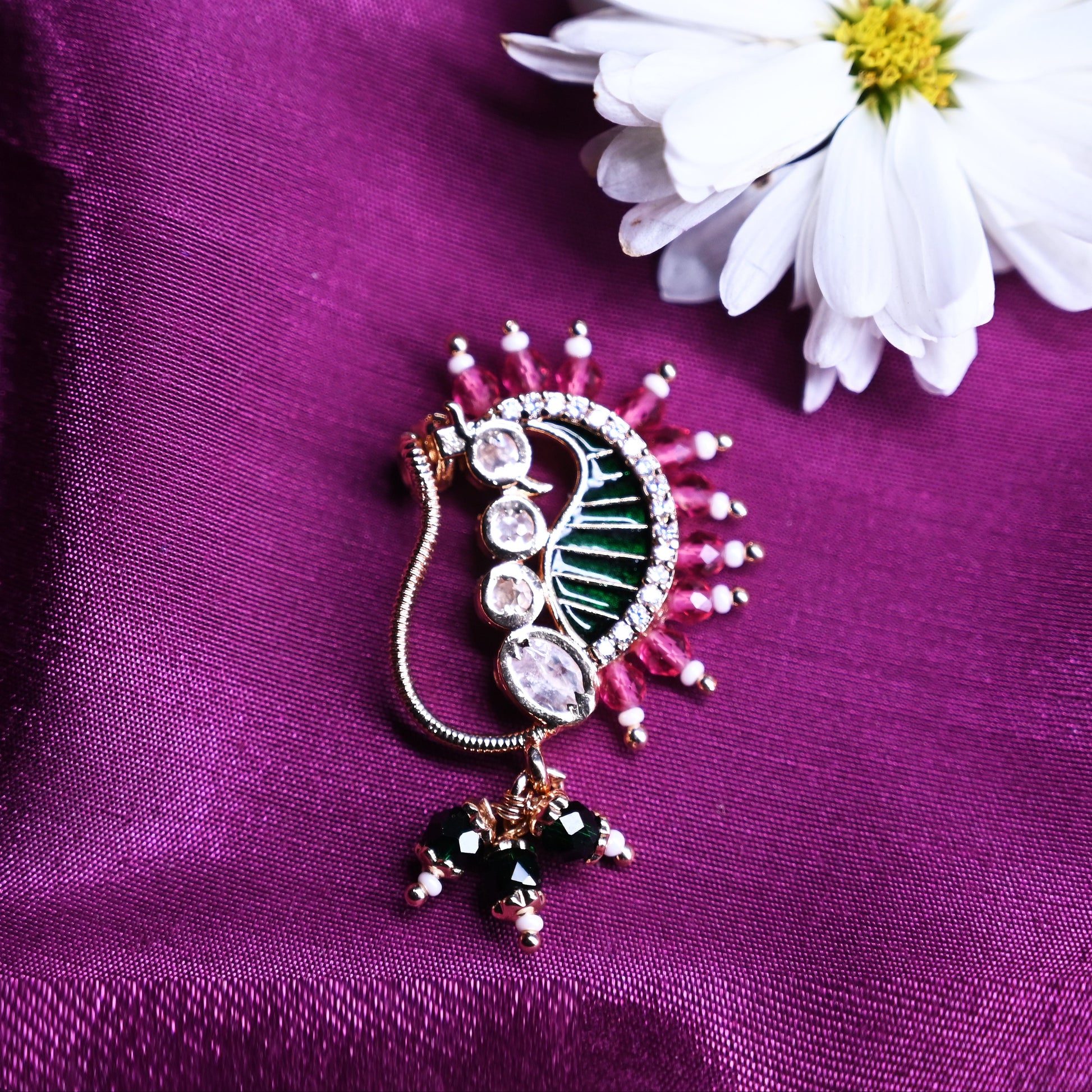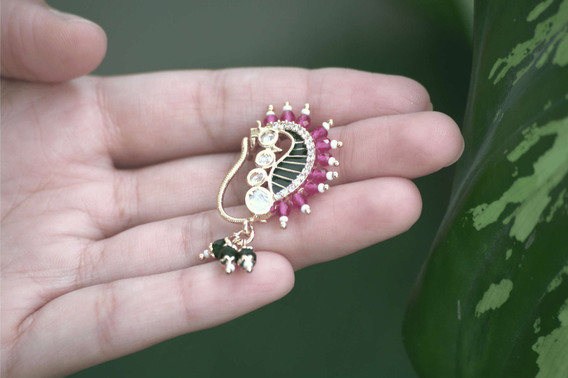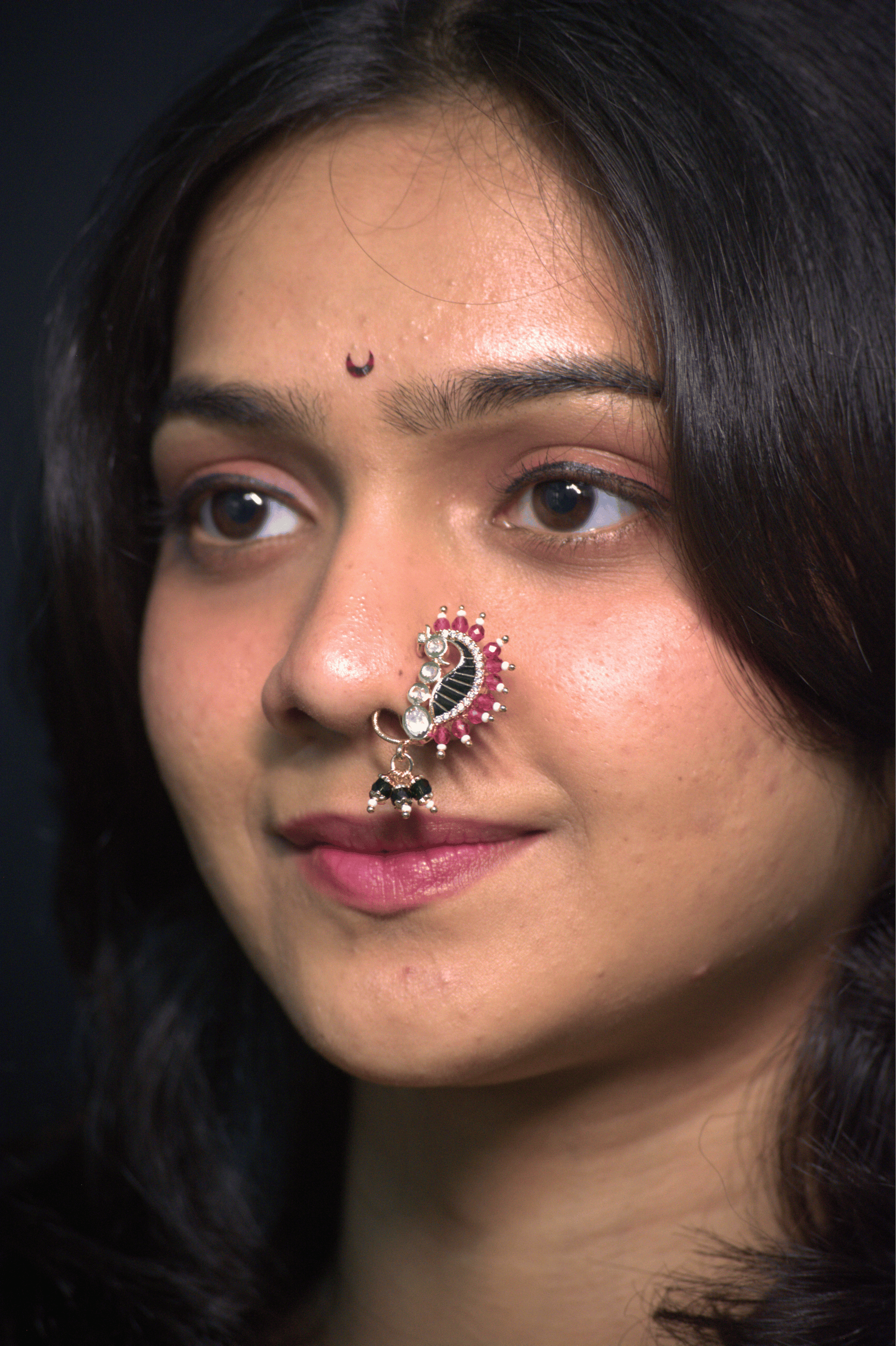 This exquisite nath is ideal for those seeking a piece that combines traditional form with striking color and contemporary detailing.