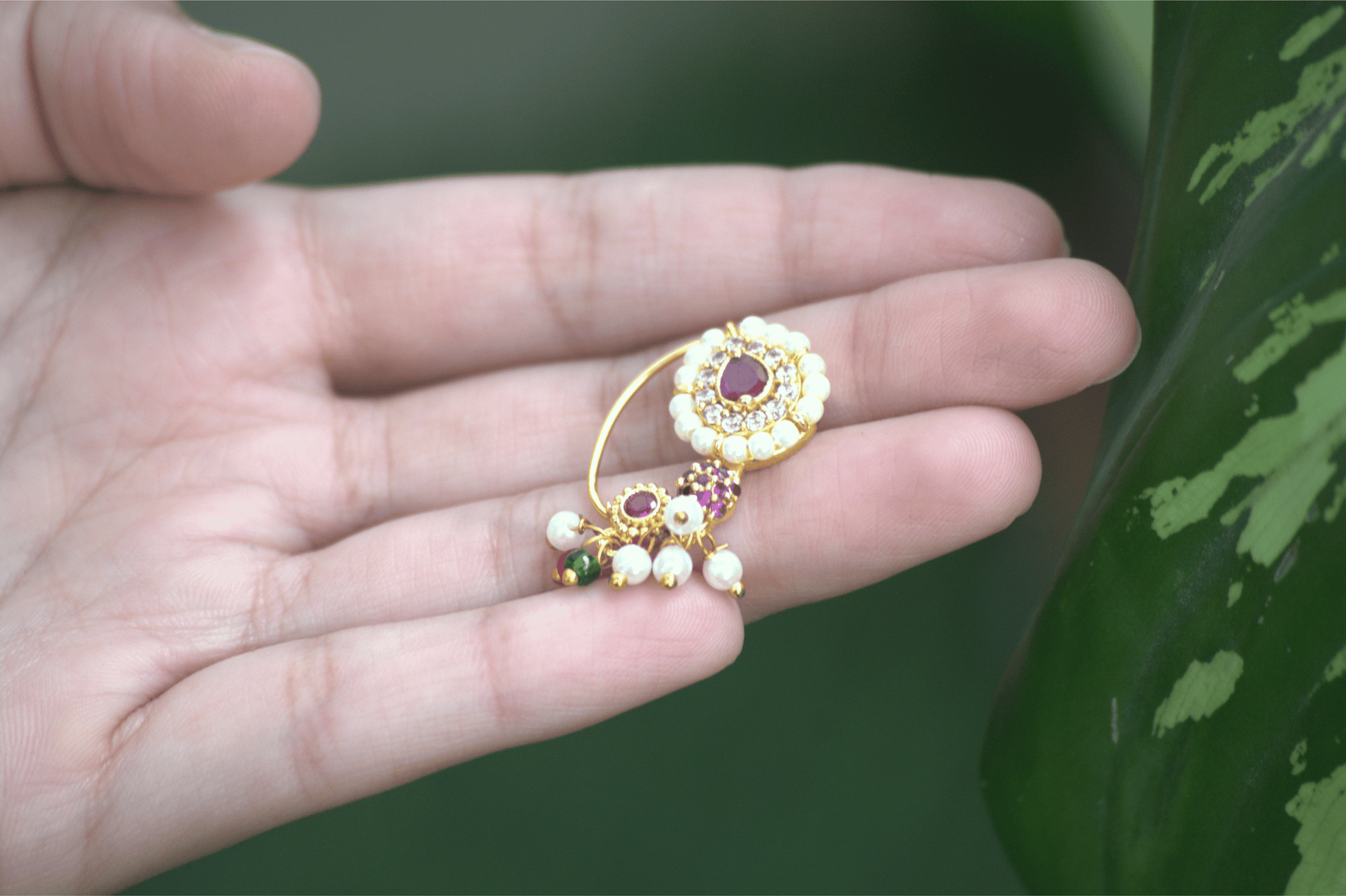 This exquisite nath is perfect for adding a rich, colorful, and traditional finishing touch to ethnic wear.