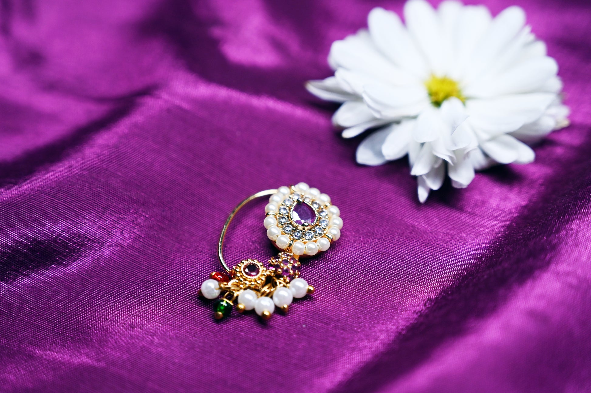 The Nath is a charming and traditionally styled piece that showcases a beautiful combination of deep jewel tones and classic pearls. The design is dominated by a large, circular upper motif centered with a teardrop-shaped amethyst-toned stone.